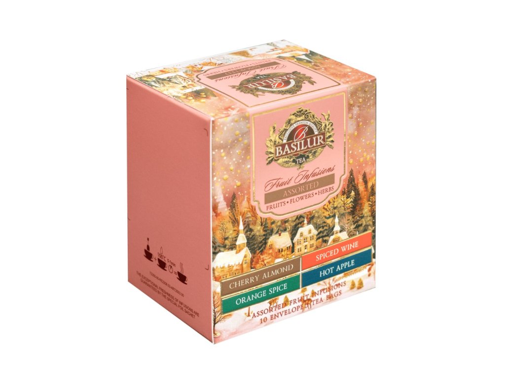 — 10 porciovaných vrecúšok ovocného čaju s mixom príchutí ako horúce jablko, korenené pomaranče, čerešňa s mandľou či spiced wine, pripravené na okamžité lúhovanie.