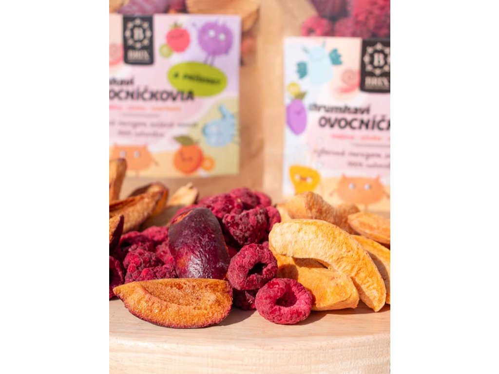 Zloženie: mrazom sušená slivka 38 %, marhuľa 37 %, malina 25 % (hmot.).