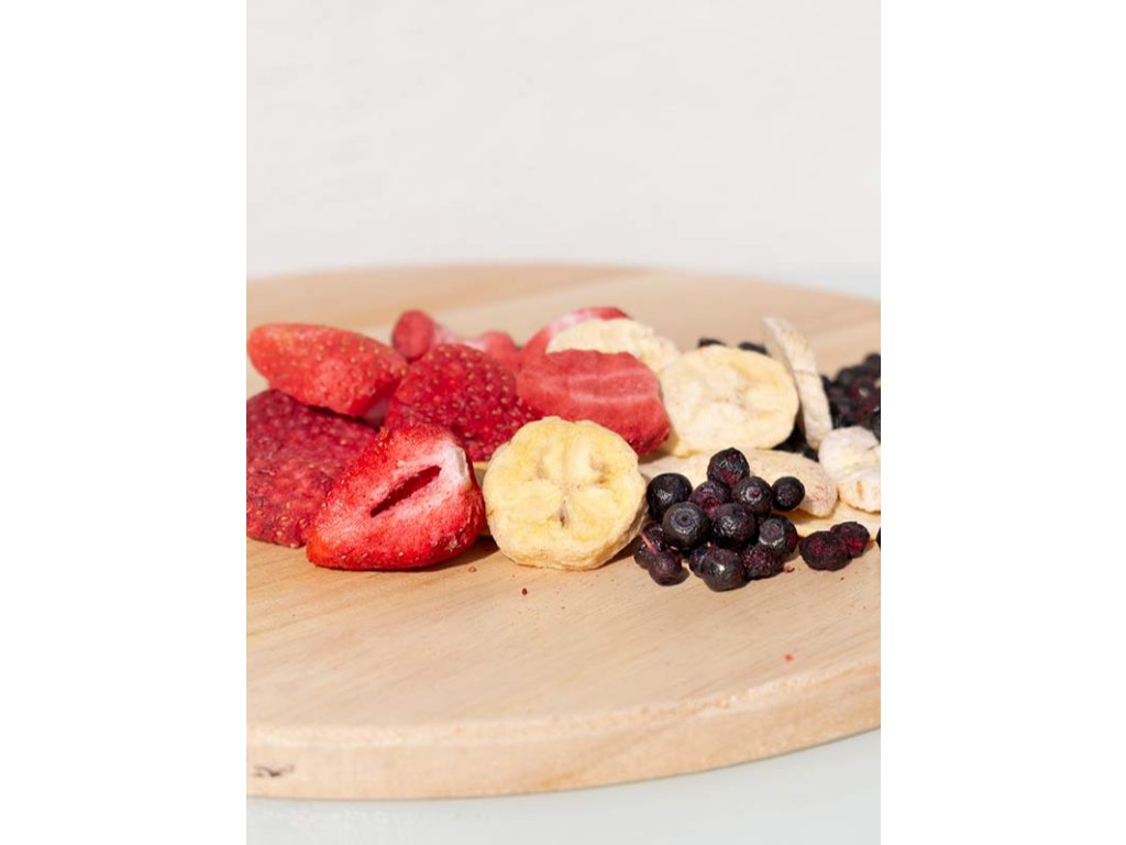 Zloženie: mrazom sušený banán 50 %, jahoda 25 %, lesná čučoriedka 25 % (hmot.).