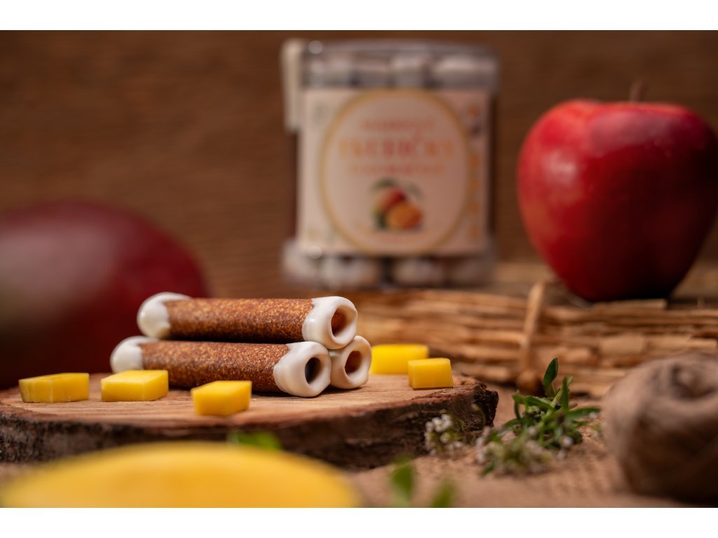 🥭🍦Lahodné ovocné trubičky vyrobené zo šťavnatej jablčnej a mangovej drene, jemne polomáčané v krémovej jogurtovej poleve – ideálna prirodzene sladká desiata bez konzervantov a lepku.