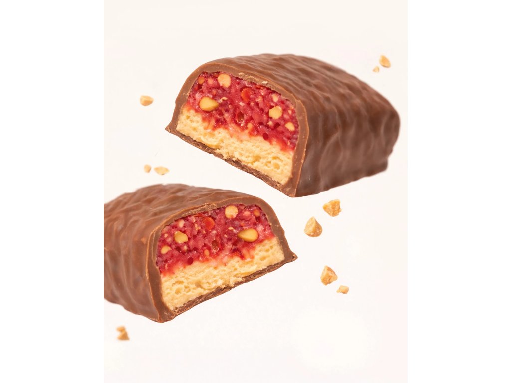 Mliečna čokoláda, arašidové maslo, malinová zložka, mliečne a rastlinné bielkoviny, hydrolyzovaný kolagén, vláknina a prírodné arómy.