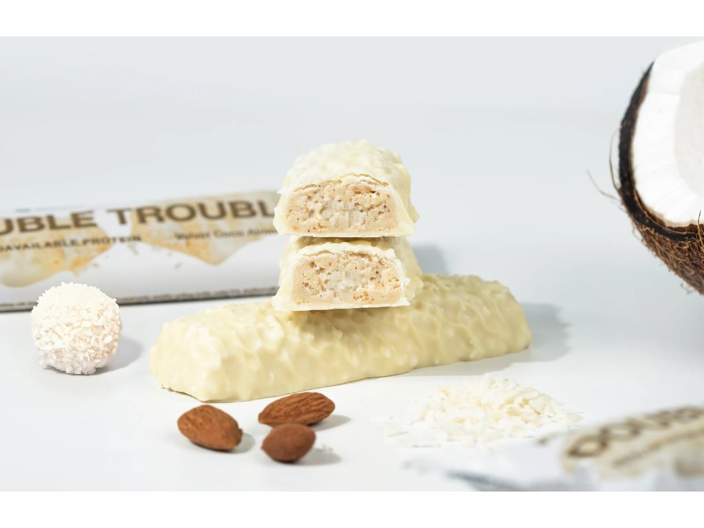 🥥🌰 Luxusný proteínový snack – dvojvrstvová čokoládou obalená tyčinka s kokosom a mandľovým krémom, s 16 g bielkovín.