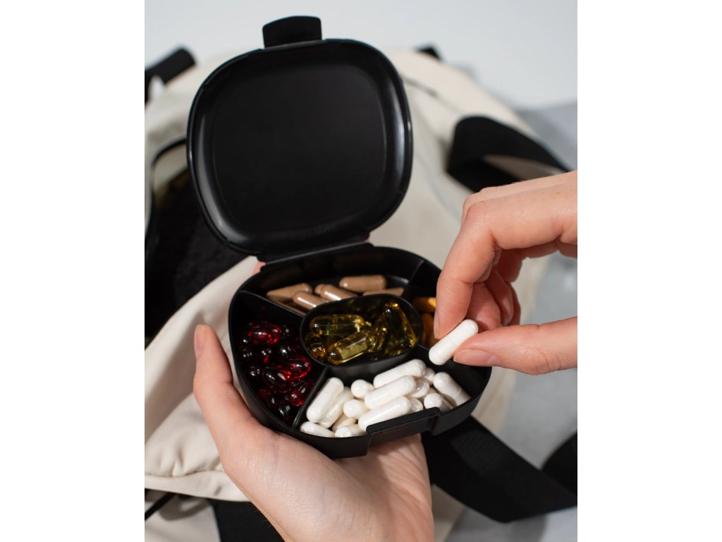 Praktický a kompaktný **organizér na doplnky stravy, vitamíny, tabletky a kapsule** s piatimi samostatnými komorami a bezpečným uzáverom pre každodenné použitie aj na cesty.